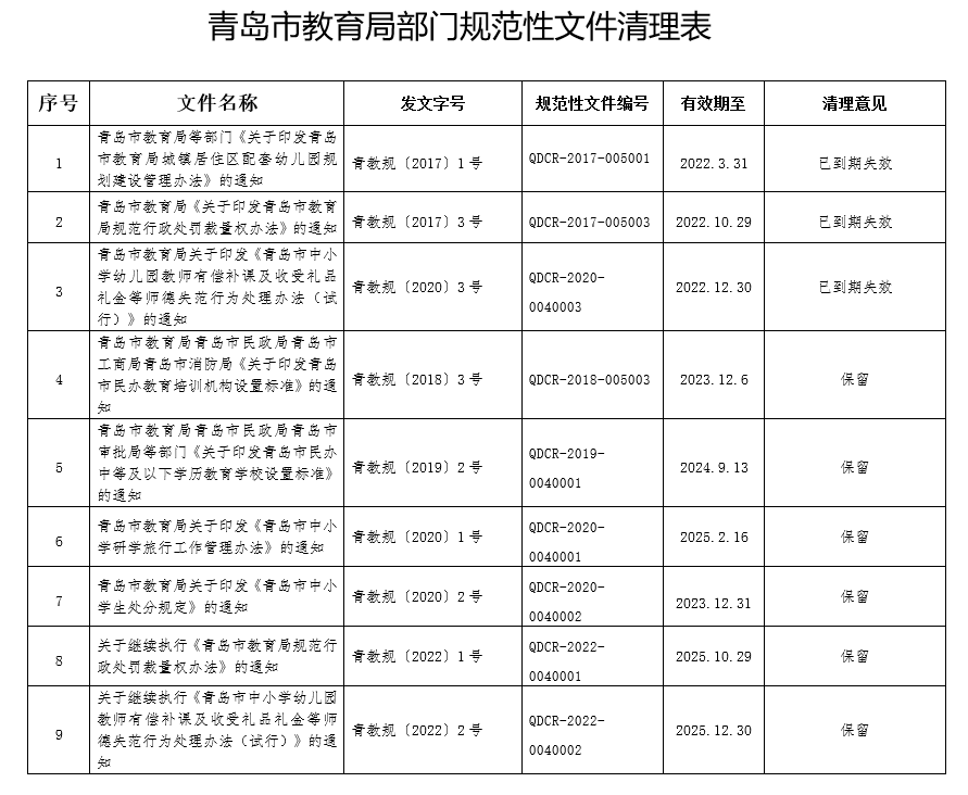 根據(jù)《青島市行政規(guī)范性文件管理規(guī)定》,青島市教育局對2022年以來有效的部門規(guī)范性文件進行了評估和清理。經(jīng)清理,已到期失效的部門規(guī)范性文件3件,現(xiàn)行有效的部門規(guī)范性文件6件?,F(xiàn)予以公布。
